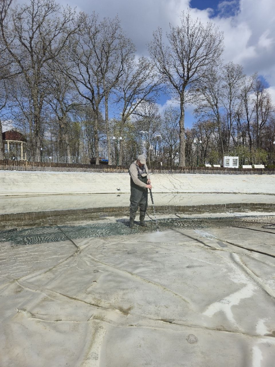 Працівники вже вимили прибережні колоди та обробляють їх спеціальним засобом для захисту від гниття та паразитів. Також вони очищають чашу водойми.