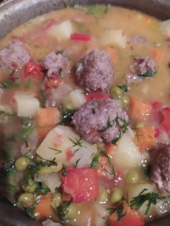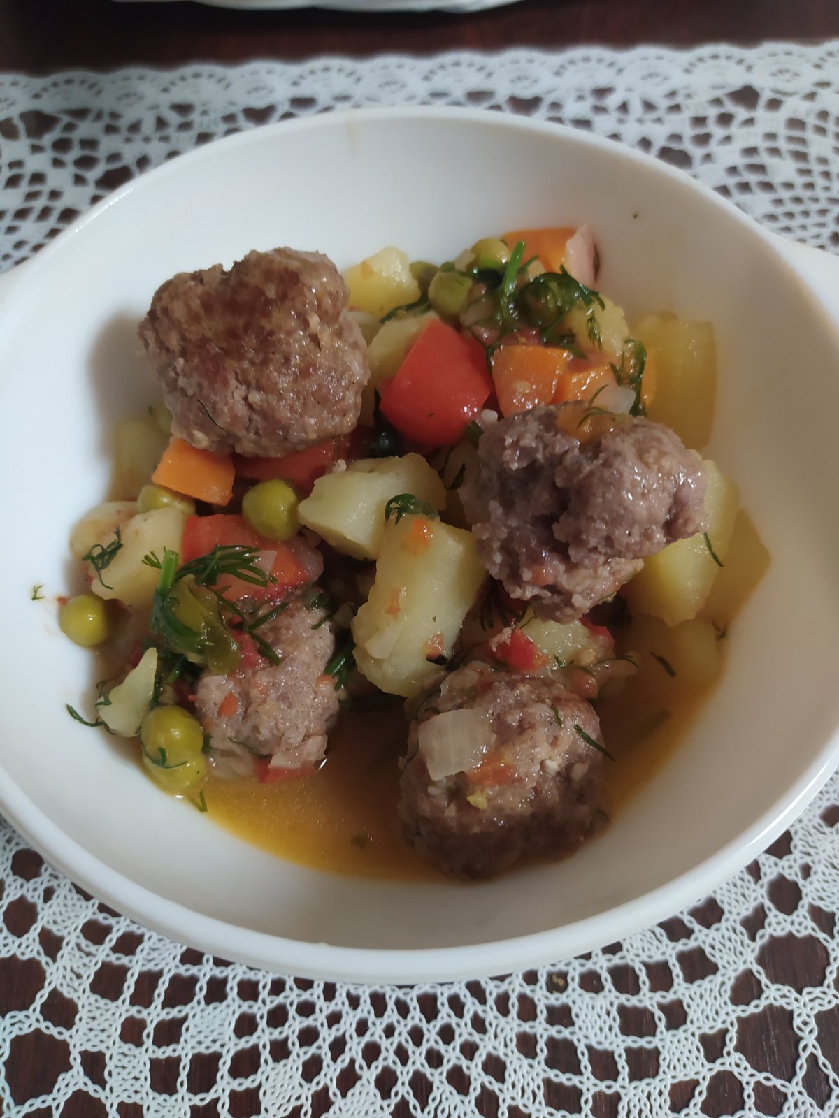 Додаємо фрикадельки. Заливаємо все бульйоном або кип'яченою водою, трохи нижче рівня продуктів. Додаємо сіль, чорний мелений перець та паприку за смаком. Тушкуємо близько 30 хв під закритою кришкою. Додаємо томатний соус, консервований зелений горошок та зелень і тушкуємо ще 5 хв. Страва готова. Смачного!