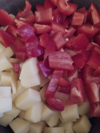 В каструлю з товстим дном викладаємо підсмажені моркву, цибулю і часник. Додаємо почищені і порізані картоплю та солодкий перець.
