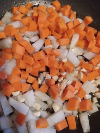 Чистимо та нарізаємо цибулю, часник та моркву і окремо підсмажуємо на пательні.