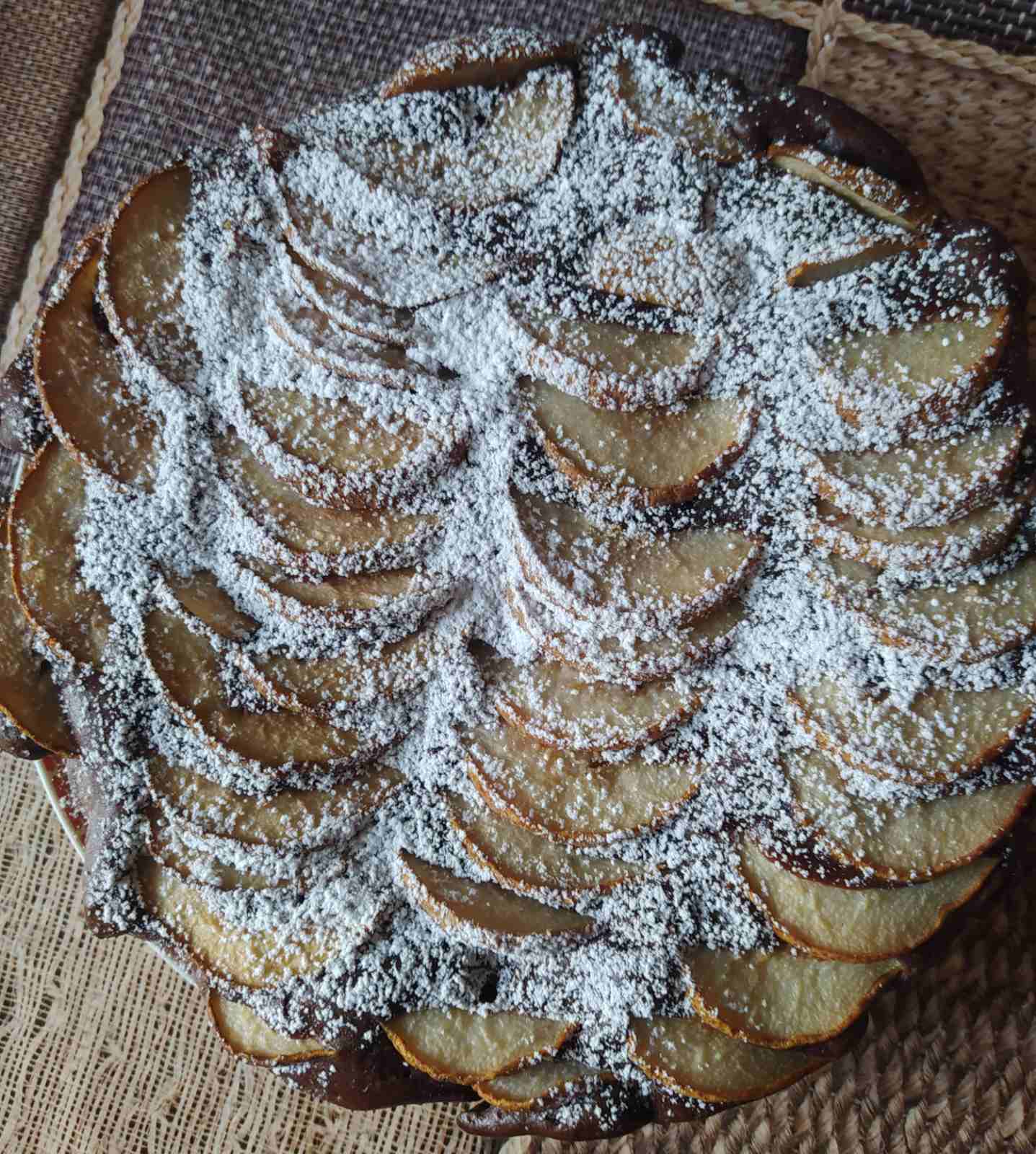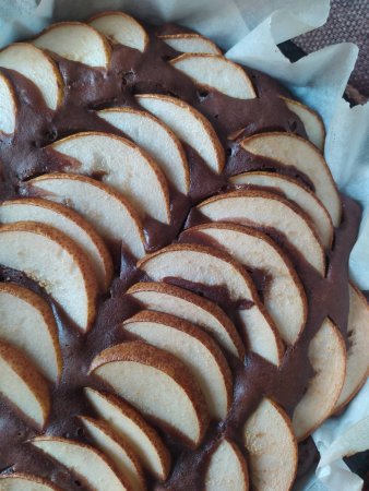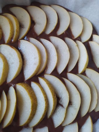 Груші, які залишились, нарізати слайсами та викласти зверху на тісто.