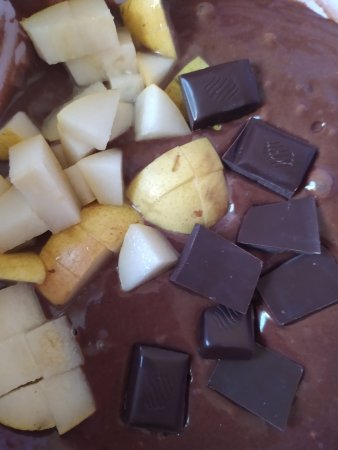 Більшу частину груш нарізати кубиками. Менша частина нам знадобиться пізніше. Шоколад поламати на квадратики. Нарізані груші та шоколад додати у тісто.