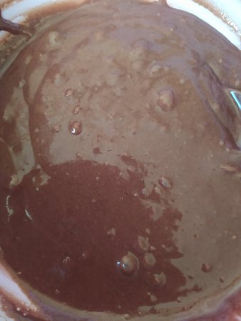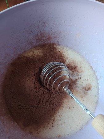Потім додати цукор і ванілін та знову збивати, доки маса побіліє. Влити молоко, олію. Всипати просіяні борошно і какао, додати розпушувач.