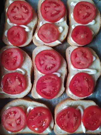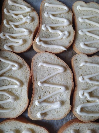 Лист для випікання застелити пергаментним папером та викласти на нього скибочки батона. Зручно, коли батон вже нарізаний. Скибочки змастити майонезом.