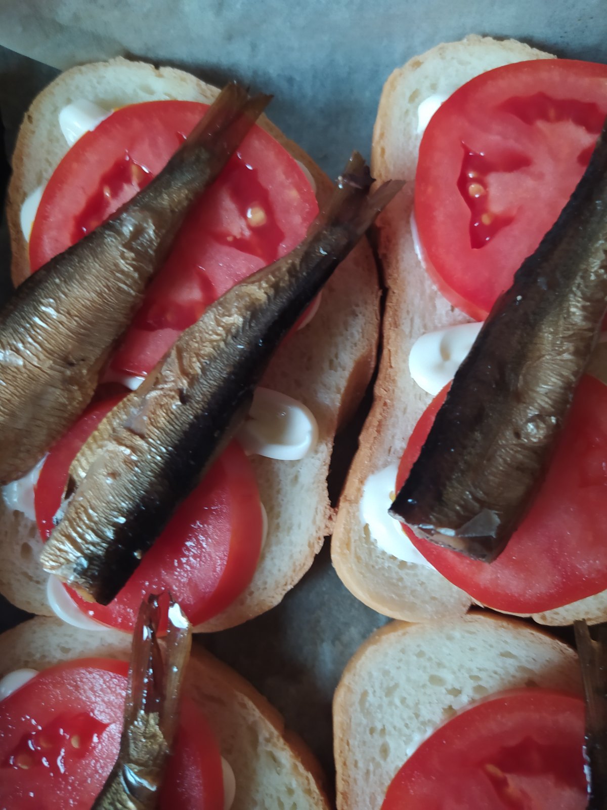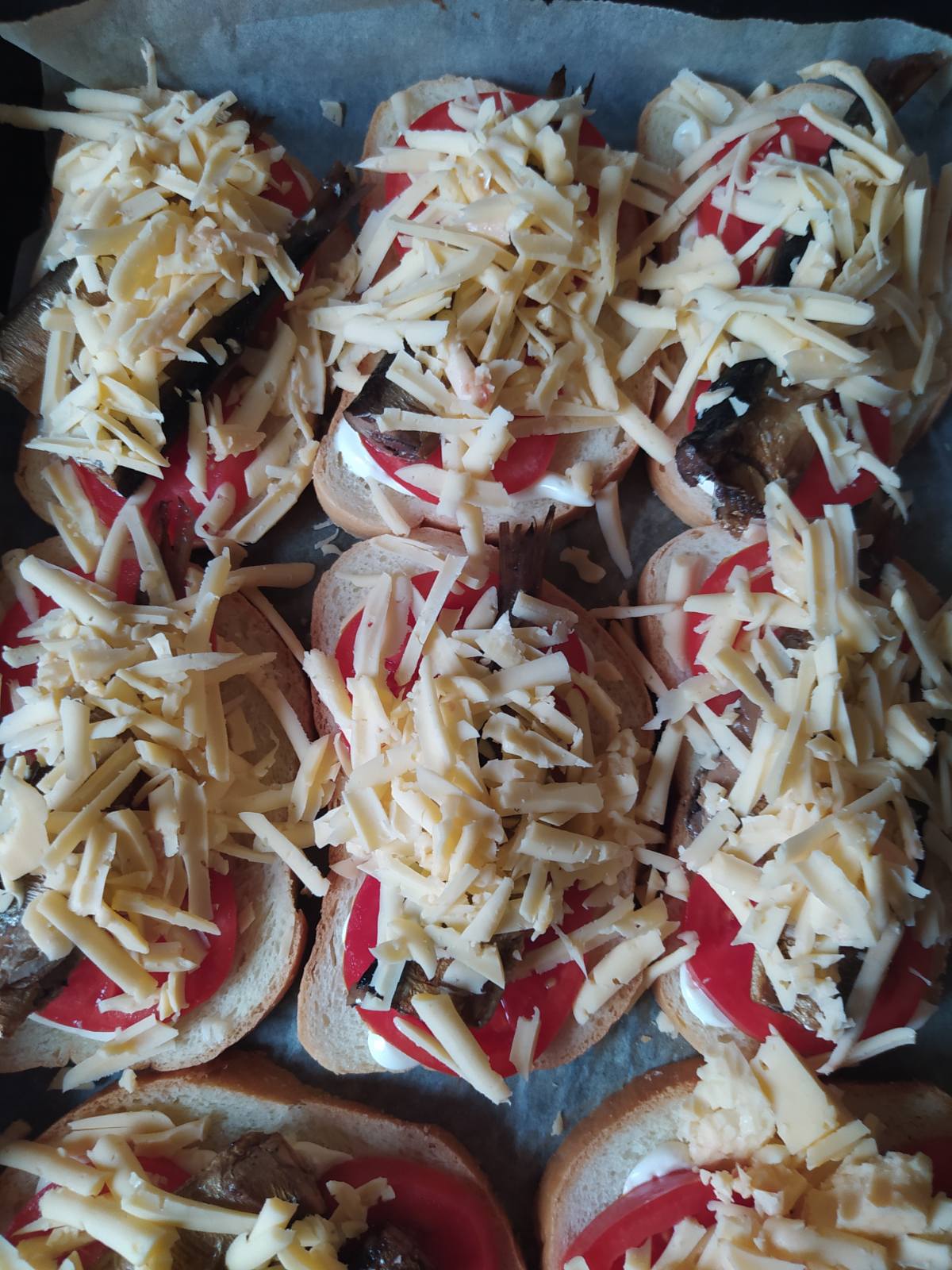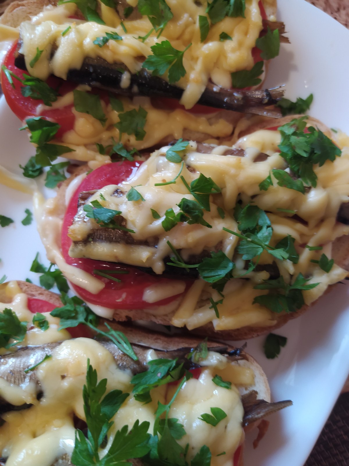 Духовку розігріти до 180 градусів та поставити у неї бутеброди на 10 хвилин. Готові гарячі бутерброди зі шпротами посипати подрібненою зеленню. Смачного!