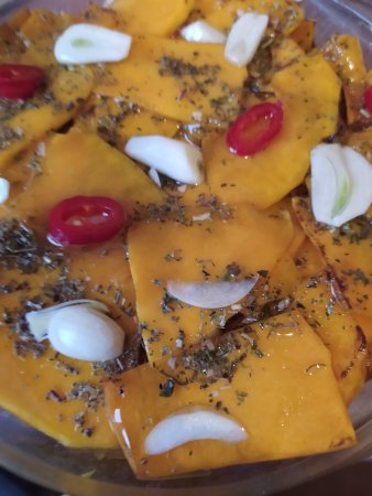 В ємність викладаємо пошарово слайси гарбуза. Підсолюємо, посипаємо часником та гострим перцем, прованськими травами та збризкуємо яблучним оцтом. Так повторюємо доти гарбуз не закінчиться. В кінці ллємо олію, щоб вона повністю покрила гарбузяні слайси.
