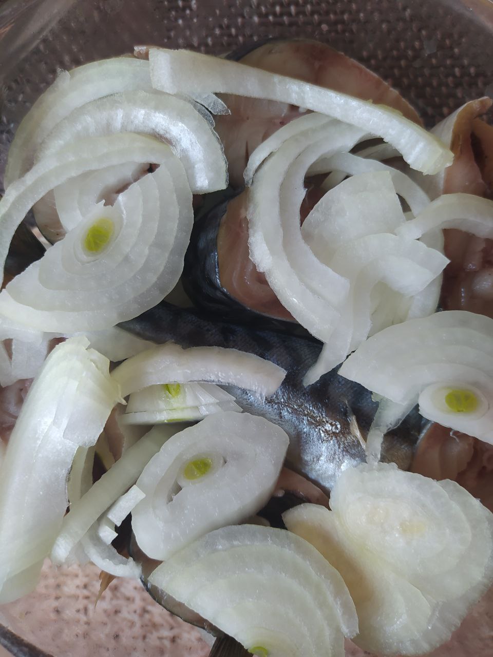 Скумбрію почистити від голови та нутрощів і нарізати шматочками. Цибулю почистити, нарізати півкільцями. На дно посудини викласти половину нарізаної цибулі.