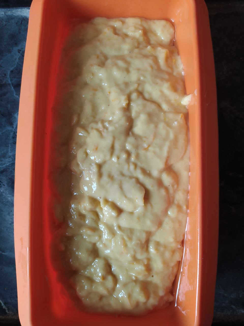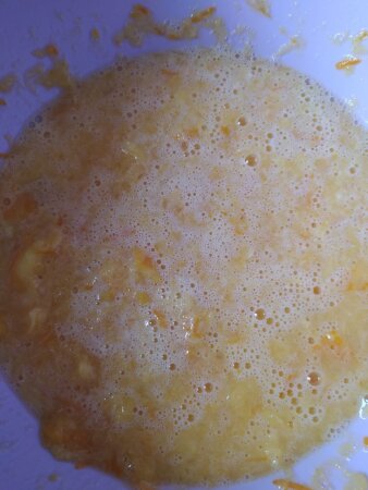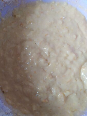 Додати цедру, яйця, цукор, олію, борошно та розпушувач. Вимішати тісто.