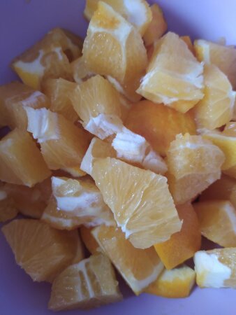 М'якоть апельсину порізати на шматочки. Частково можна залишити шкірочку.