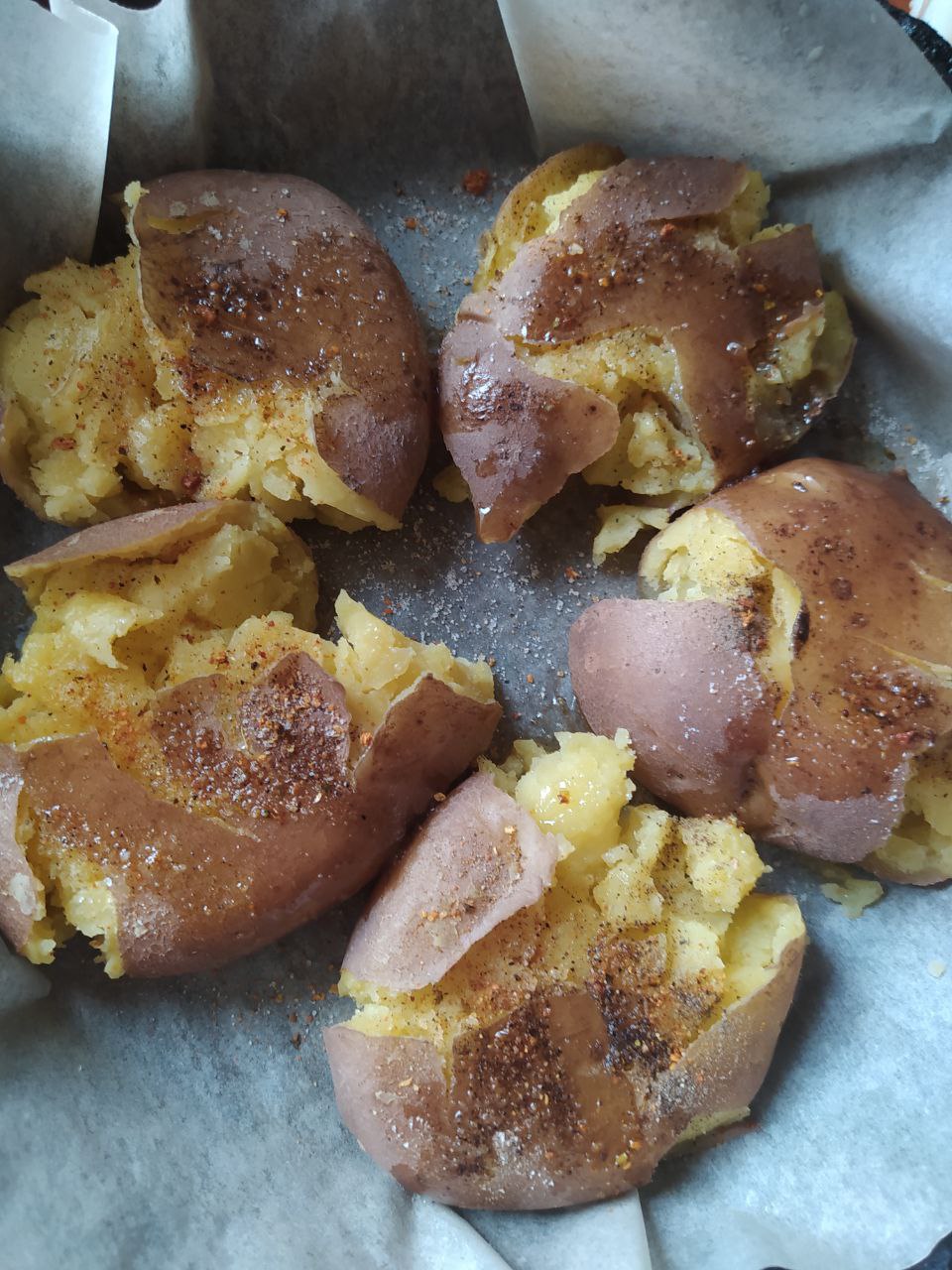 Кожну картоплину обережно придавити тарілкою, надаючи їй більш пласкої форми. Викласти на деко для запікання, застелене пергаментним папером. Кожну картоплину злегка збризнути олією, посолити, посипати чорним меленим перцем та іншими спеціями за бажанням - ми використали приправу до картоплі. Поставити у розігріту до 180 градусів духовку та запікати близько 20 хв.