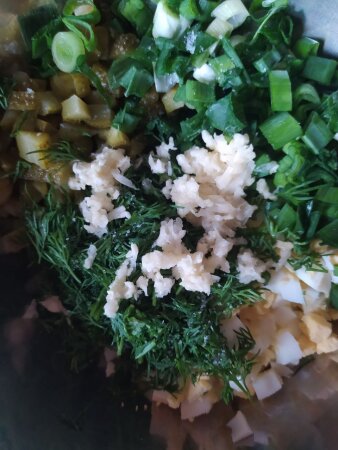 Додати дрібно нарізані кріп та зелену цибулю, видавити через прес часник.