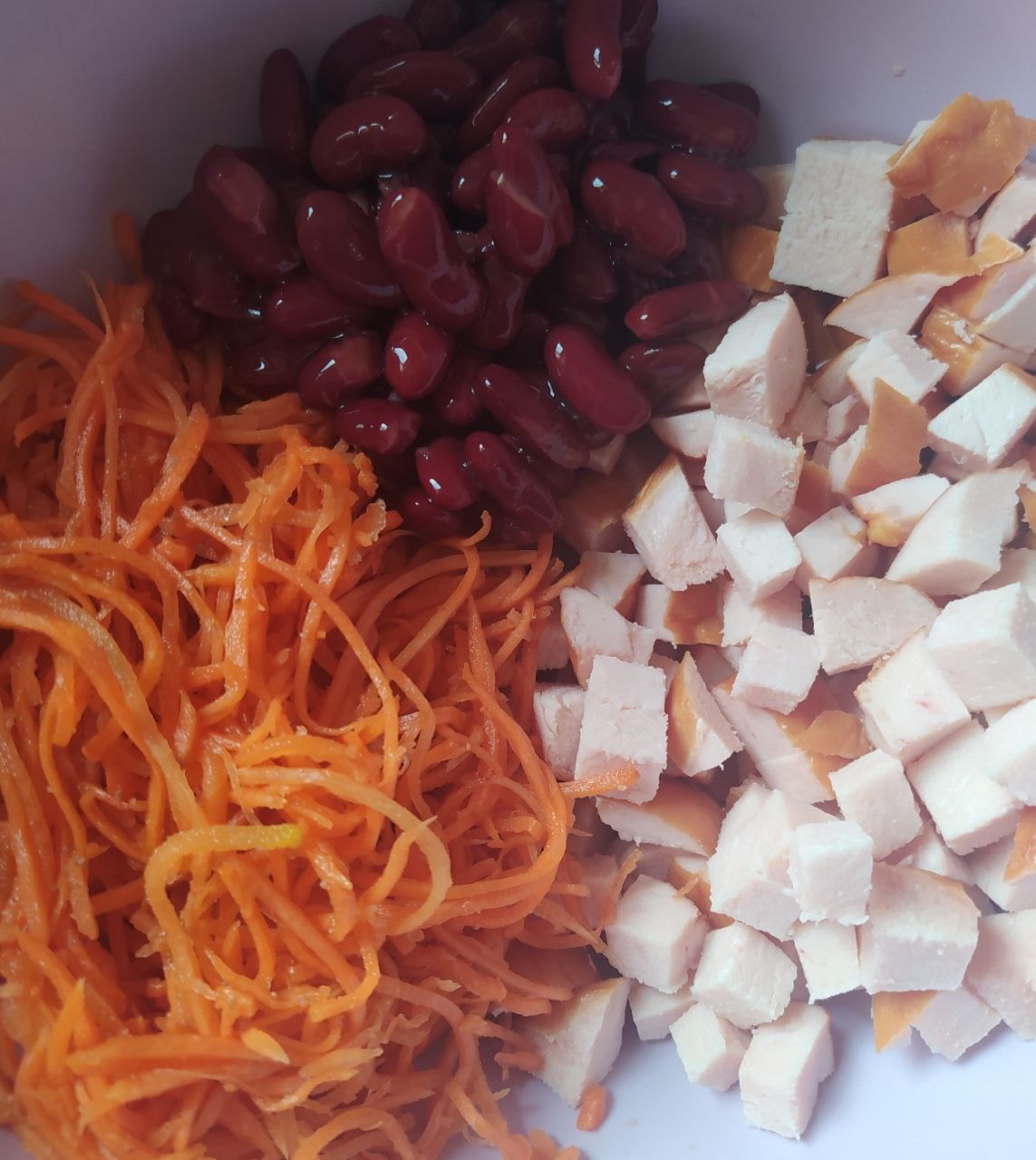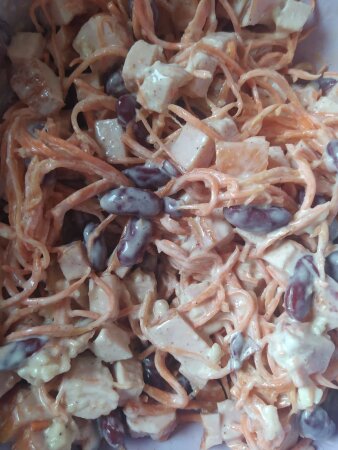 Куряче філе нарізати кубиками. З квасолі злити рідину. Моркву по-корейськи та квасолю додати до курячого філе.